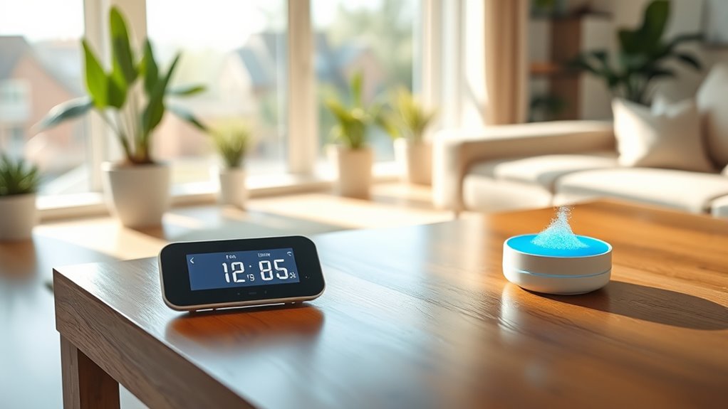 Using air quality monitors helps you identify indoor pollutants like dust, VOCs, and CO₂ levels in real time. They connect to your smartphone or smart home systems, providing instant alerts and allowing automated responses like turning on air purifiers. This proactive approach protects your health and improves air quality. Understanding how these devices work and their privacy features lets you manage your environment better—keep going to learn more about maximizing their benefits.