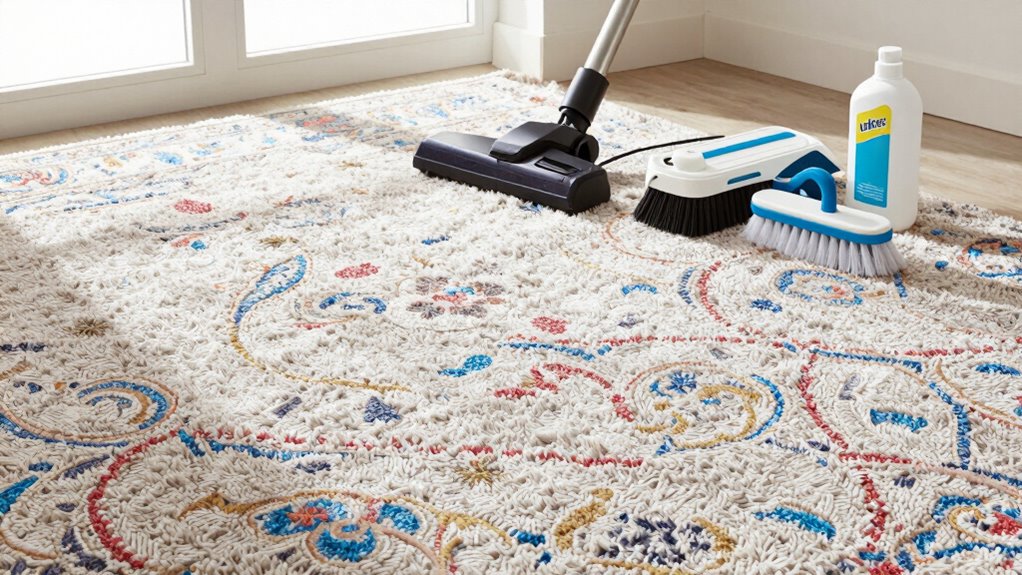 To achieve a thorough deep clean, selecting the right tools and products is essential. A powerful upright extractor or steam cleaner can effectively lift dirt from carpets and area rugs, ensuring a deep clean. For spot treatments, especially pet stains, use enzyme-based stain removers that break down organic residue. A handheld upholstery tool can help target stubborn spots without over-wetting the surrounding area. Consider using microfiber pads or brushes to enhance cleaning power and remove embedded dirt. For heavily soiled areas, pre-treat with a carpet pre-spray designed for deep cleaning. Always choose products compatible with your carpet type to prevent damage. With these tools and products, you’ll tackle pet stains and dirt buildup efficiently, leaving your carpets looking fresh and revitalized.