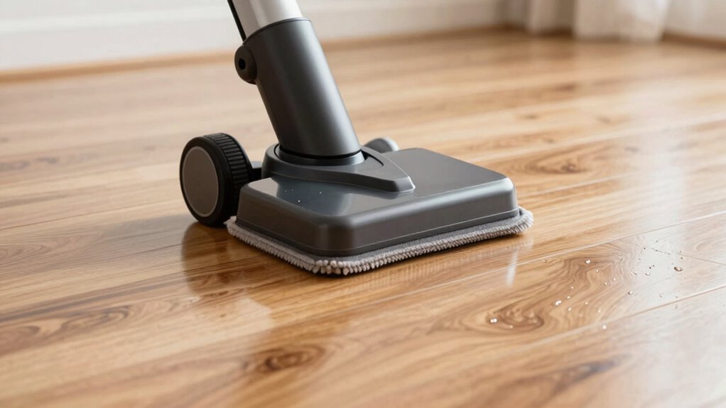 Using distilled water is like giving your floor a gentle rain—pure, free of minerals that can cause streaks. Water quality plays a vital role in streak prevention, and opting for distilled water means fewer mineral deposits left behind, ensuring a streak-free shine. It’s a simple step that keeps your cleaning routine smooth and your floors gleaming, without the cloudy haze of leftover residues.