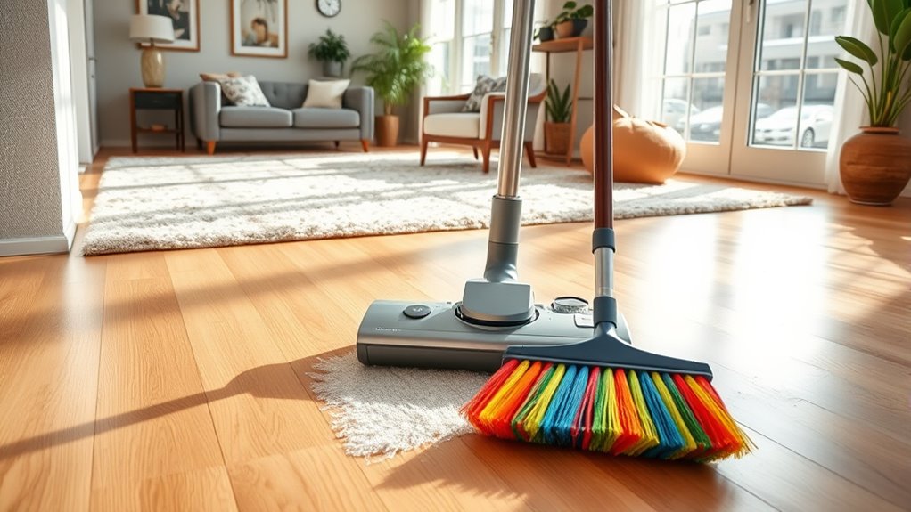 Vacuuming before sweeping can make your cleaning more effective by removing loose dirt and debris from your floors first. This approach minimizes dust disruption, preventing dust clouds from spreading during sweeping. When you vacuum first, you effectively lift and trap dust, dirt, and allergens from deep within carpets and surfaces. This step enhances allergen removal, improving indoor air quality and reducing respiratory irritation. By tackling the heavier debris with your vacuum initially, you make sweeping easier and more thorough afterward. Vacuuming also prevents dirt from being pushed around or ground into the floor during sweeping. Additionally, proper cleaning techniques play a crucial role in maintaining a healthy living environment. Incorporating air quality improvement strategies, such as using HEPA filters in your vacuum, can further enhance the benefits of this cleaning order. Using advanced technology like robotic vacuums equipped with HEPA filters can automate and optimize this process. Employing dust control methods helps keep your living space cleaner and reduces allergen circulation. Overall, vacuuming first guarantees a cleaner, healthier environment by efficiently removing allergens and reducing airborne dust, setting a strong foundation for a more effective overall cleaning process.