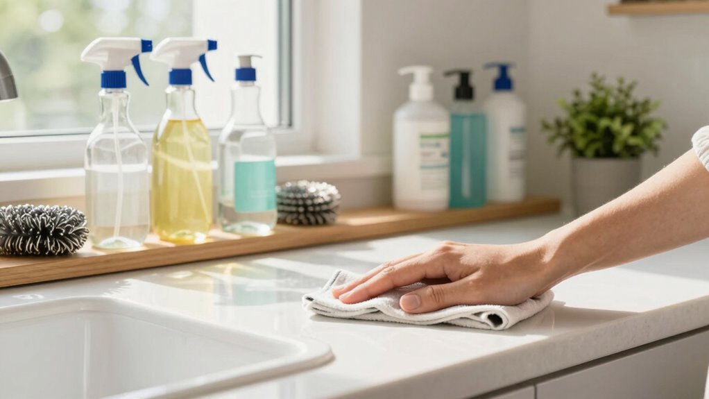 You can train your family members to adopt low-waste cleaning habits by involving them in the process and emphasizing the benefits. Encourage family involvement through shared cleaning tasks and clear explanations of eco-friendly products. Foster habit formation by setting consistent routines and celebrating small successes. Lead by example, showing commitment to sustainability, and gradually introduce reusable tools and eco-friendly products, making low-waste cleaning a natural part of your household routine.