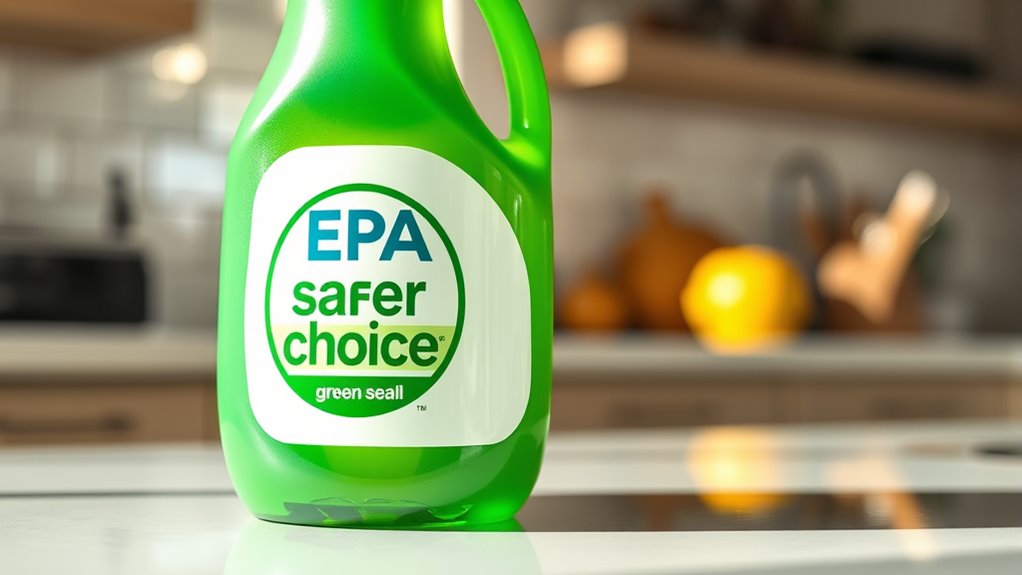 Eco-labels like EPA Safer Choice and Green Seal help you identify products that meet strict environmental standards. They guarantee that items are tested for biodegradability, safety, and sustainability, so your choices support environmental health. These labels are based on rigorous certification processes and scientific testing, giving you confidence you’re choosing genuinely eco-friendly products. If you want to learn about what these labels stand for and how they benefit you, there’s more to discover ahead.