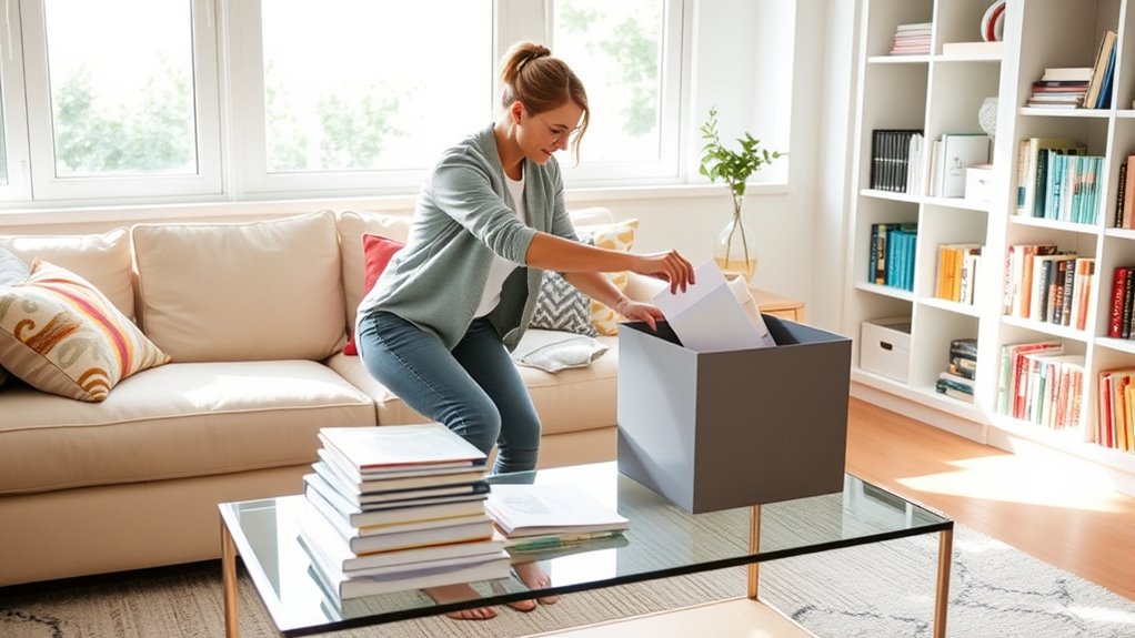 Imagine your family working together to keep the living room tidy. You can involve family members by assigning specific chores, like sorting mail or putting away toys, making decluttering a team effort. Encourage family involvement by setting clear expectations and creating a routine. Delegating chores not only speeds up decluttering but also teaches responsibility, fostering a sense of shared ownership and pride in maintaining a clutter-free home.
