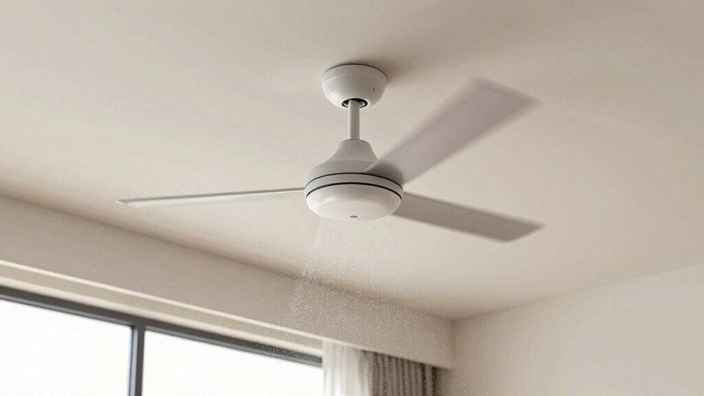 Have you ever noticed dust suddenly falling from your ceiling fan blades after turning it on? That’s because the airflow created by the fan dislodges dust that has settled on the blades and nearby surfaces. As the fan spins, it increases air circulation, which stirs up dust accumulation in the room. The movement loosens particles that have clung to the blades over time, causing them to drop. This process helps remove dust from hard-to-reach spots, preventing it from settling into your furniture and surfaces. The stronger the airflow, the more dust gets dislodged and falls to the floor or furniture below. Additionally, air circulation can improve overall room cleanliness by reducing airborne dust particles. So, while ceiling fans improve air circulation, they also unintentionally aid in dust removal, making cleanup easier and helping your furniture stay cleaner longer. Proper fan maintenance can further enhance this dust-removing effect by keeping blades clean and efficient. Regular cleaning of the blades ensures optimal dust dislodging and maintains the fan’s overall effectiveness.