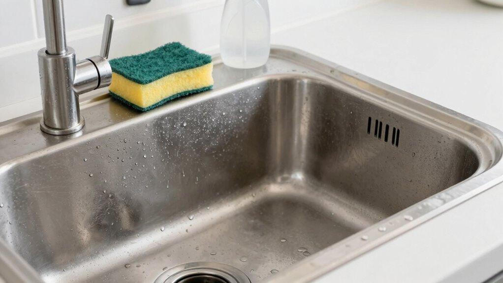 Since sink fixtures, faucet handles, and other high-touch surfaces are frequently touched, they can quickly become breeding grounds for germs and bacteria. To disinfect effectively, start by washing sink fixtures and faucet handles with dish soap and warm water to remove grime. After cleaning, use a disinfectant spray or wipe to kill lingering germs. Keep hand sanitizer nearby; applying it after touching these surfaces helps maintain cleanliness throughout the day. Regularly disinfect high-touch areas, especially in busy kitchens, to prevent cross-contamination. Incorporating disinfection protocols that utilize proper cleaning agents and techniques is essential for maintaining a hygienic environment. Proper cleaning techniques also help in reducing bacteria more effectively. Using effective disinfectants that are suitable for kitchen surfaces ensures thorough germ elimination. Remember, consistent disinfection with proper products is key to minimizing bacteria and keeping your kitchen safe.