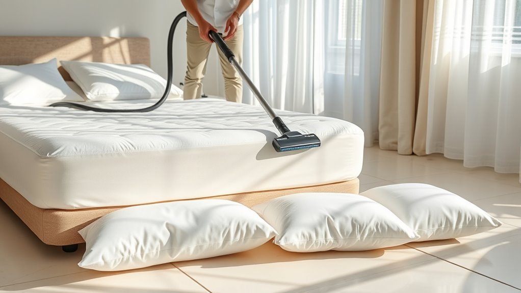 A quarterly bedroom refresh is the perfect way to keep your space feeling fresh and inviting throughout the year. It’s a simple routine that can make a big difference in your overall comfort and health. One of the most effective steps is to focus on mattress cleaning and pillow maintenance. These are often overlooked but are essential for maintaining a clean, hygienic sleeping environment. Regularly vacuuming your mattress helps remove dust, dead skin, and allergens that accumulate over time. Use a handheld vacuum or the upholstery attachment on your vacuum cleaner to thoroughly clean the surface, paying special attention to seams and edges where dirt tends to gather. This not only extends the life of your mattress but also improves your sleep quality by reducing potential irritants. Additionally, incorporating automation technologies in your cleaning routine can help streamline maintenance tasks and ensure consistent results.