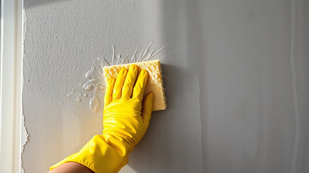 To keep your space bright and clean, washing your walls quarterly is essential for removing grime, dust, and stains. Start by protecting furniture and gathering gentle cleaning tools like soft sponges and microfiber cloths. Wash from top to bottom in gentle, circular motions, paying attention to corners and switches. Rinse and dry thoroughly to prevent streaks and damage. Want to learn the best techniques for a streak-free finish? Keep going to find out more.