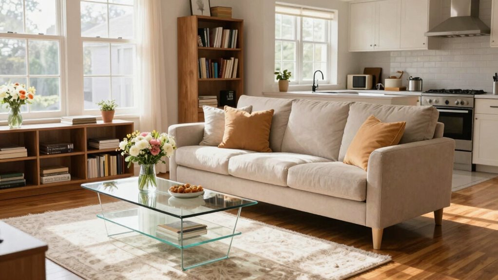 Imagine your cleaning routine as a well-choreographed dance, each room moving seamlessly into the next. By following this order, you’ll save hours and avoid unnecessary backtracking. I once tackled my entire house in half the time by planning my route—like a GPS guiding me efficiently. Just like a skilled chef prep ingredients before cooking, prepping your rooms guarantees a smooth, swift cleaning session. Stick to the plan, and watch your home sparkle effortlessly.
