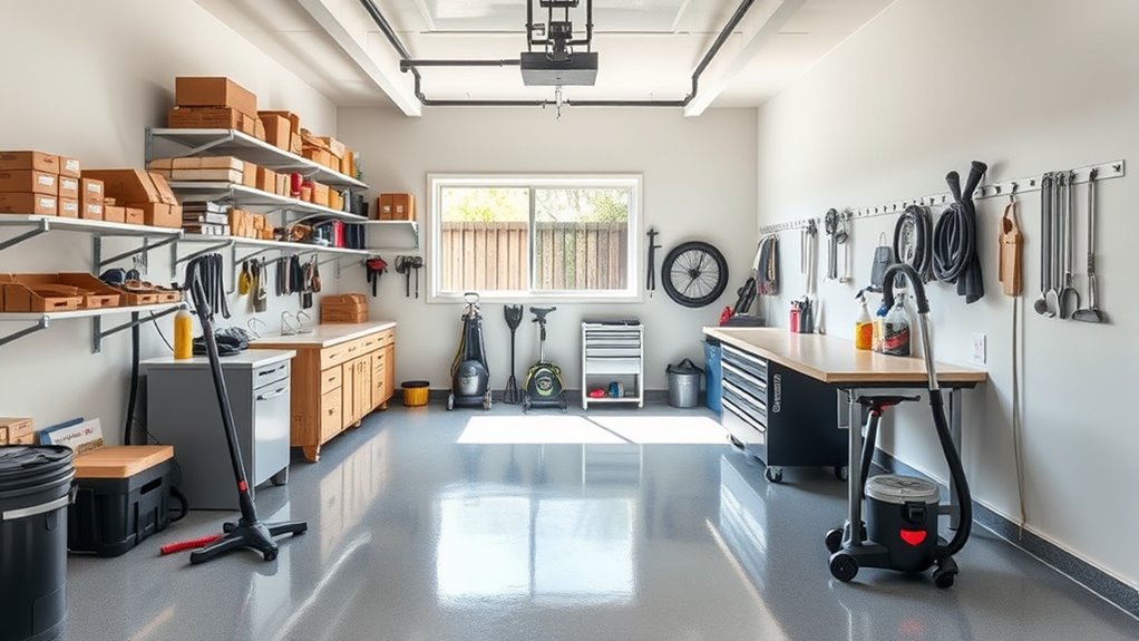 To effectively overhaul your garage yearly, start with a thorough deep clean and declutter session. Sweep away dirt, remove junk, and evaluate what’s worth keeping. Use clear bins, labels, and vertical storage to organize tools, sports gear, and gardening supplies into designated zones. Regular maintenance keeps clutter at bay and maximizes space. By following these steps, you’ll create a safer, more functional garage—and there’s more helpful tips ahead to keep your space organized all year round.