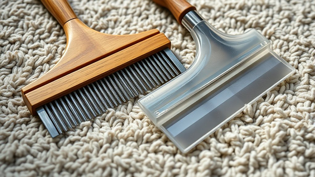 Carpet rakes and squeegees are great tools for tackling stubborn pet hair embedded deep in carpets. Carpet rakes with sturdy, widely spaced teeth loosen and lift hair, making vacuuming more effective, especially on thick or shaggy carpets. Squeegees with flat rubber blades gently pull hair to the surface for quick cleanups. Both are reusable, eco-friendly, and cost-effective options that can prevent buildup and extend your carpet’s life. Keep exploring to discover more helpful tips.