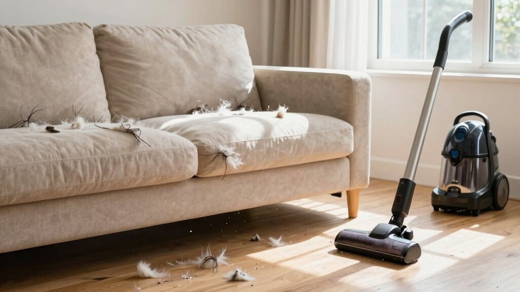 Imagine battling an unstoppable fur storm—you need the best tools to tame it! Use pet hair removal tools like rubber gloves, lint rollers, or vacuum attachments designed for pet hair. These tools grab hair effortlessly, turning chaos into clean space. Pair them with shedding prevention tips like regular grooming and a healthy diet. With the right tools and strategies, you’ll keep your home fur-free and your pet happy!