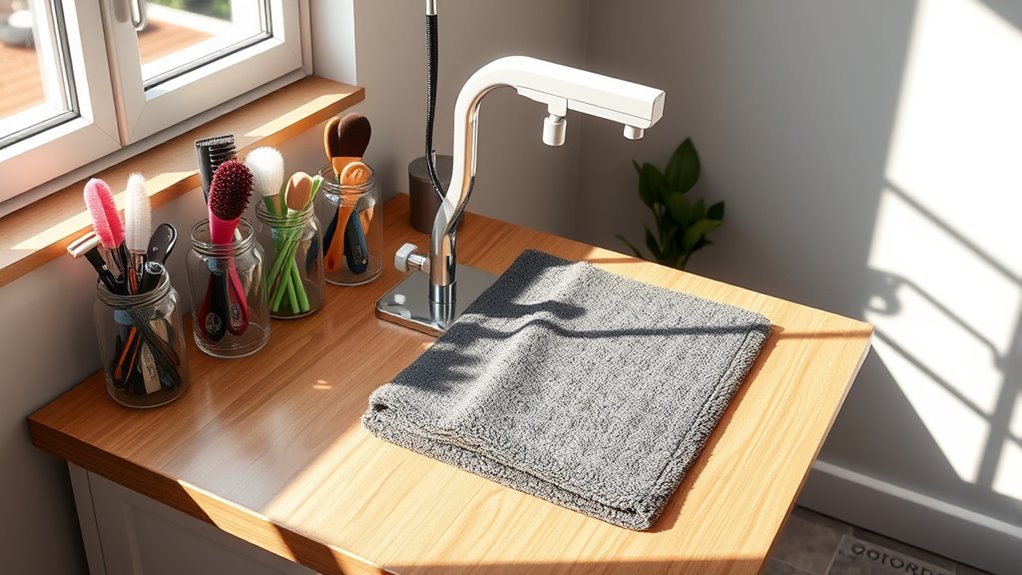 To create an at-home grooming station, choose a well-lit, easy-to-clean space like a laundry room or bathroom, and keep it free from distractions. Organize your tools in labeled containers or on hooks for quick access, and include safety supplies like non-slip mats and towels. Keep essentials like brushes, scissors, and grooming products neatly arranged to maintain a tidy area. If you continue, you’ll discover tips to make grooming safer, easier, and more comfortable for your pet.