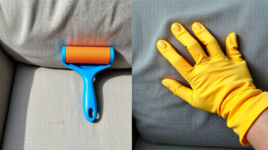Both lint rollers and rubber gloves effectively lift pet hair, but they excel in different ways. Lint rollers are great for quick surface cleanup and are convenient for clothes and furniture, though their adhesive sheets need frequent replacing. Rubber gloves, on the other hand, are reusable and work well for grooming pets and removing hair from large areas. To discover which method suits your needs best, keep exploring the details below.