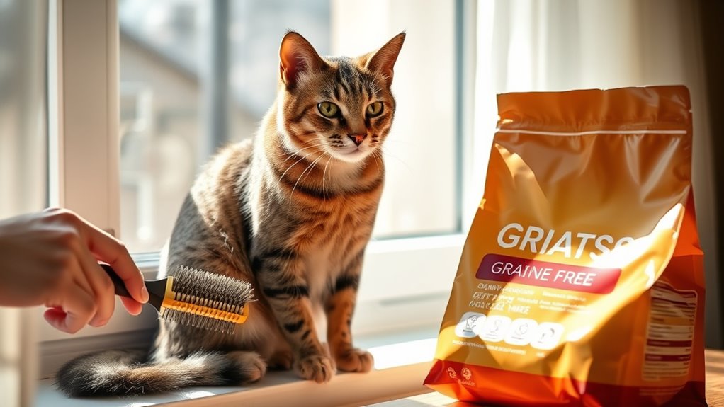 To reduce cat shedding, focus on feeding a balanced diet rich in omega fatty acids, antioxidants, and vitamins like E and biotin, which improve skin and coat health. Regular grooming, especially daily brushing, helps remove loose hair before it falls and decreases hairballs and dander. Combining proper nutrition with consistent grooming not only keeps your home cleaner but also supports your cat’s overall health. Keep exploring for more tips to manage shedding effectively.