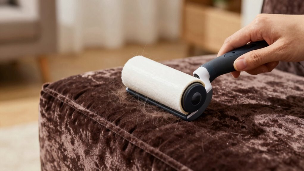Pet hair removal tools are your superhero in battles against stubborn hair! For stubborn hair solutions, grab a gentle rubber brush or a fine-toothed comb designed for delicate fabrics. These tools loosen hair without harming velvet, making cleanup a breeze. Use a fabric-safe vacuum attachment for extra power, or try dampening a microfiber cloth to lift remaining pet hair effortlessly. With these tools, you’ll conquer pet hair like a pro!