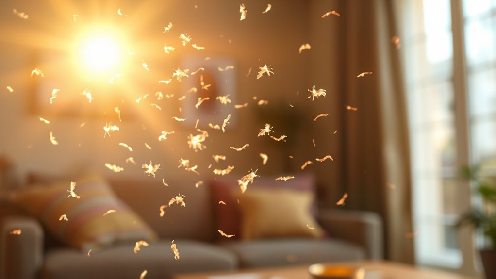 Pet dander consists of tiny skin flakes shed by animals like cats and dogs, which stay airborne for hours and settle on surfaces. When you inhale this airborne dander, your immune system overreacts, causing symptoms like sneezing, itchy eyes, and congestion. Even hypoallergenic pets produce enough dander to trigger reactions. To better understand how to manage these triggers and reduce your symptoms, keep exploring effective cleaning and pet care strategies.
