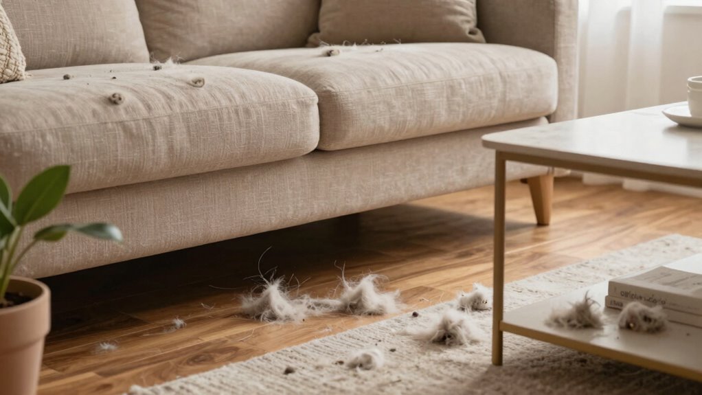 Upholstery and cushions are prime hiding spots where pet hair easily accumulates because their soft fibers trap particles that fall or cling to your pet’s fur. The fabric fibers in sofas, chairs, and cushions act like tiny nets, catching pet dander and loose hairs with every nap or cuddle session. Over time, these fibers hold onto the hair, making it difficult to see but easy for it to build up. Regular vacuuming helps remove surface hair, but deep-seated pet dander can remain embedded within the cushion’s layers. The more your pet lounges, the more hair and dander settle into these soft spots, creating a hidden reservoir of allergens that can affect your indoor air quality and comfort. Deep-cleaning techniques can help dislodge and remove embedded pet hair and dander from these soft, fibrous layers. Employing appropriate cleaning tools designed for upholstery can enhance the effectiveness of your cleaning routine and help maintain a healthier indoor environment. Additionally, understanding how to prevent pet hair buildup can reduce the amount that gets trapped in these soft fibers over time. Incorporating innovative cleaning methods inspired by energy-efficient and sustainable technologies can further improve your maintenance routine while reducing environmental impact. Using HEPA-filter vacuums can significantly improve the removal of microscopic pet dander from soft surfaces, promoting better air quality in your home.