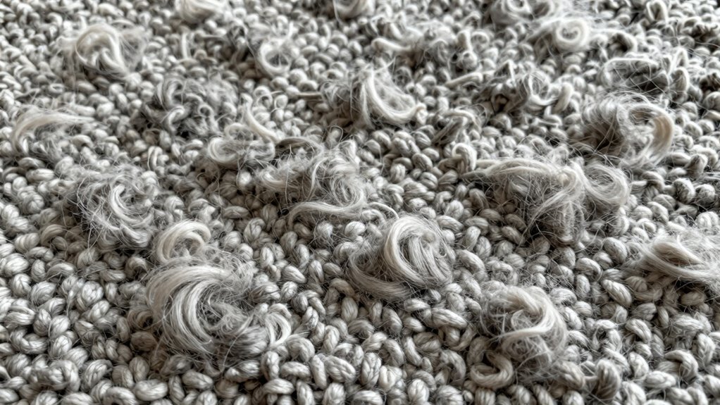 Using a rug with appropriate surface texture can also make a noticeable difference in reducing pet hair accumulation and simplifying cleaning routines. Your choice of rug affects how much pet hair it traps and how easy it is to clean. Dense, textured rugs might look cozy, but they demand more maintenance because they hold onto hair tightly. If you want to cut down on cleaning time, opt for rugs with lower fiber density and a flatter surface texture. Keep in mind, though, that other factors like fiber material also matter—synthetic fibers often trap hair more than natural ones. But to start, focusing on fiber density and surface texture will significantly improve your pet hair problem, making your cleanup routine less of a hassle and your living space more comfortable.