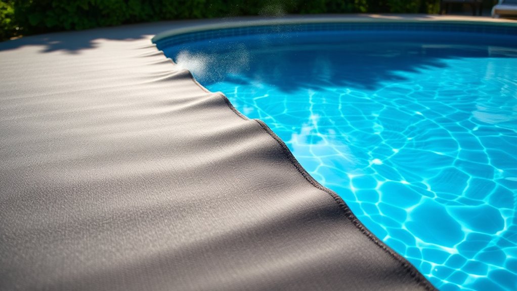 Pool covers substantially decrease water evaporation rates by creating a barrier that blocks heat loss and reduces exposure to wind. This helps retain solar heating, keeping your pool warmer longer. With increased wind resistance, fewer droplets escape, saving water and energy. You’ll notice less water top-up needed and maintained pool temperature, making your swimming experience more comfortable and eco-friendly. Plus, it minimizes chemical loss, maintaining water quality efficiently.