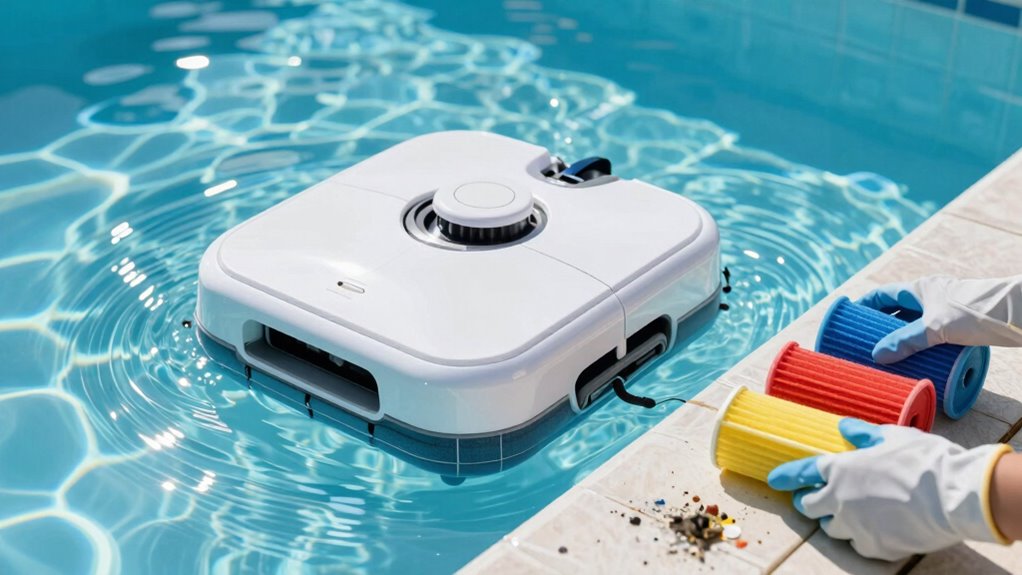 Ironically, your robot cleaner’s filters are probably the most neglected part of maintenance. You should replace filters based on your cleaning frequency—typically every 2-4 weeks for maximum performance. Regular filter replacement ensures your robot keeps working efficiently and your pool stays sparkling. Don’t wait until it’s clogged or underperforming; stay ahead with timely filter changes, and your robot will thank you with a longer, more effective lifespan.