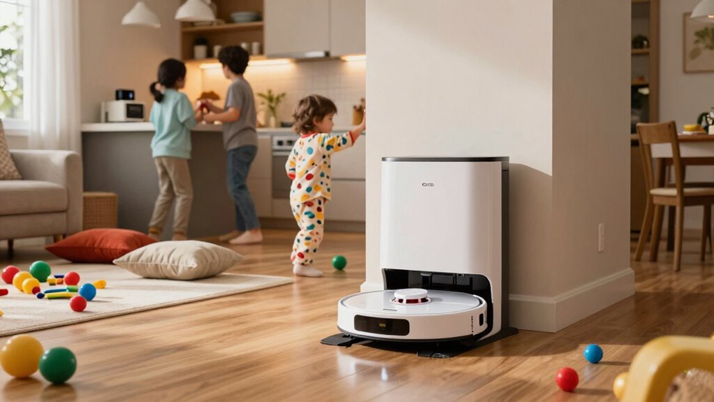 In busy family homes, robot vacuum docks aren’t just a luxury—they’re an indispensable tool that simplifies cleaning routines. By leveraging smart home integration and paying attention to battery health, you guarantee your robot vacuum remains a dependable helper for years to come. It’s a smart investment in your home’s cleanliness and your peace of mind.