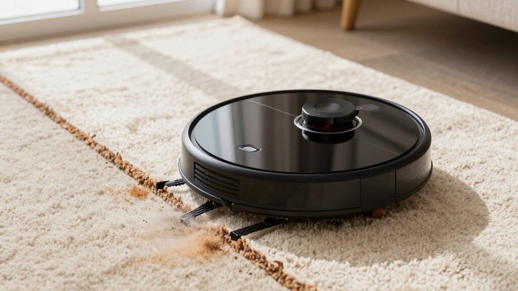 Even with edge-boosting accessories and manual touch-ups, you might still encounter issues with your robot vacuum’s edge cleaning. Common problems often stem from poor edge detection or navigation algorithm limitations. To troubleshoot, start by checking if your robot’s sensors are clean and unobstructed, as dirt or debris can impair edge detection. Ensure the navigation algorithms are functioning correctly; outdated firmware or software glitches can cause missed spots. Additionally, verify that your vacuum’s boundary settings aren’t restricting its movement near edges.