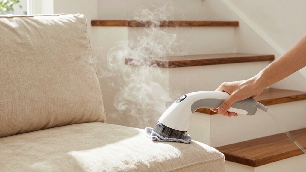 Yes, you can use a steam cleaner on many upholstery types, but you must consider steam cleaner safety and upholstery material compatibility first. Check your furniture’s care label for specific cleaning instructions. Some fabrics, like silk or velvet, may not tolerate steam well and could get damaged. Always test a small, hidden area first and use the lowest steam setting to prevent oversaturation and guarantee safe cleaning.