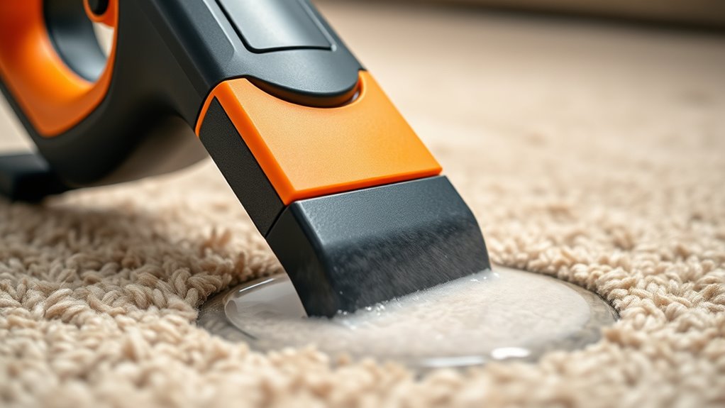 Handheld carpet extractors are your trusted allies in moments of need, symbolizing resilience amid stains and grime. When dirt threatens to overpower your space, they remind you that a simple tool can restore clarity and comfort. Use them wisely, and you’ll see that even the toughest messes can be cleaned away, revealing a fresh start. Remember, sometimes, the smallest tools carry the greatest power to renew your environment and spirit alike.