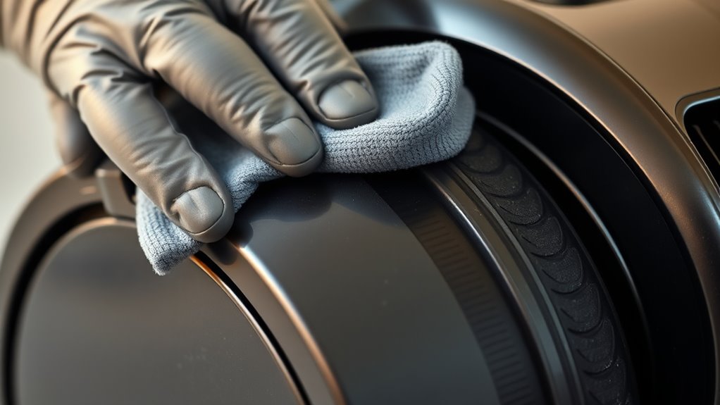 To keep your vacuum running smoothly, regularly wipe down the exterior with a microfiber cloth to remove dust and smudges. Pay special attention to the vents and crevices to prevent dust buildup that can hinder performance. For the wheels, wipe away dirt, hair, and debris with a damp cloth, and check for cracks or stickiness. If you continue exploring, you’ll discover more simple ways to maintain your vacuum’s peak condition.