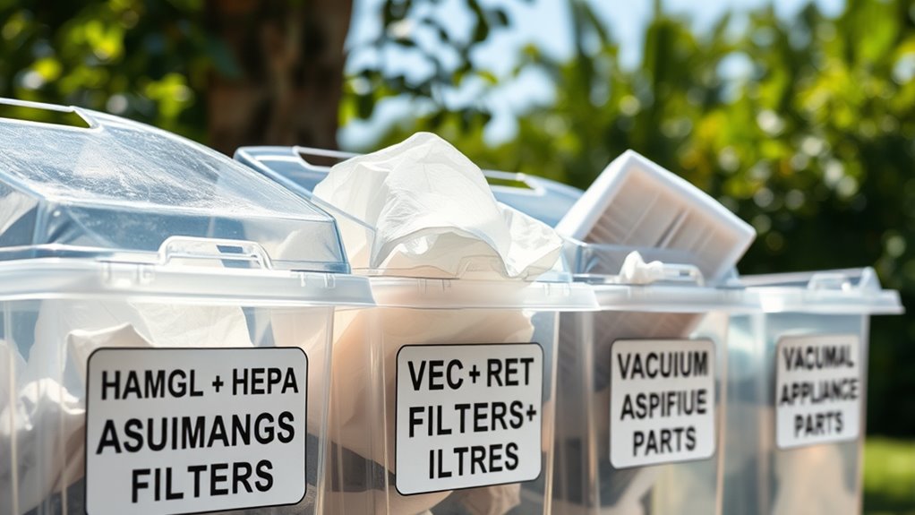 You can recycle old vacuum parts by checking local recycling programs for vacuum bag recycling and filter disposal options. Remove any non-recyclable components, like plastic or metal, and clean them if needed. For vacuum bags, see if your community accepts them in recycling or composting. Otherwise, consider repurposing or safely discarding them. Always follow manufacturer guidelines and local regulations to guarantee responsible disposal of vacuum parts.
