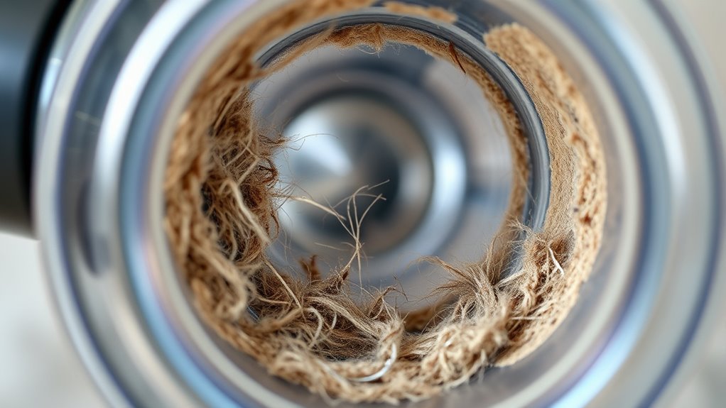 Imagine vacuuming your living room and noticing it’s losing power. Pet hair buildup is a common culprit, causing airflow obstruction. Yes, pet hair can clog your vacuum, especially around the brush roll or hose. It traps debris, reducing suction. To fix this, regularly check and clear any pet hair buildup from these areas. Keeping your vacuum clean guarantees it maintains ideal airflow and suction power.
