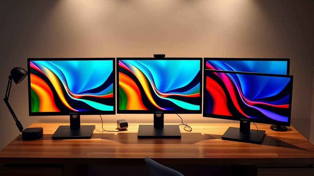 To guarantee seamless connectivity and a smooth user experience, it’s essential to choose 4K color E-Ink monitors with multiple input options like HDMI, USB-C, DisplayPort, and USB-A. This assures compatibility with a wide range of devices, including laptops, desktops, smartphones, and gaming consoles. Look for monitors supporting the latest standards, such as HDMI 2.1 or USB-C with Power Delivery, for future-proofing and peak performance. Features like multi-port hubs or intelligent voice control can boost flexibility, making your setup more convenient. Also, check that the connection ports are conveniently located and sufficient in number to avoid needing extra adapters. This way, you’ll enjoy reliable, versatile connectivity tailored to your workspace needs.