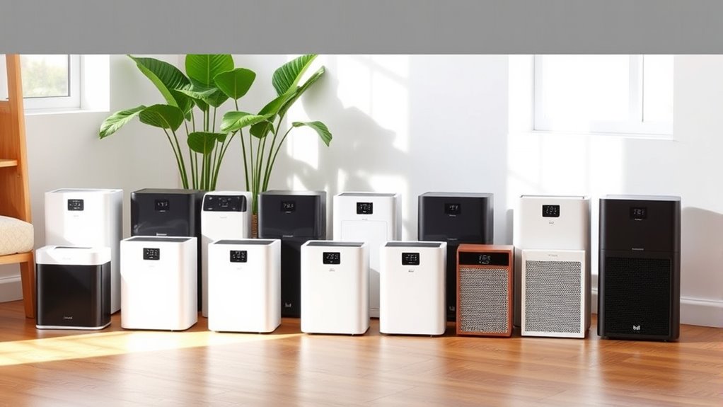 If you’re looking for affordable air purifiers that deliver great value, I recommend models with reliable HEPA filters, multiple modes, and smart features like auto-off and filter reminders. I focus on units suitable for different room sizes—small bedrooms or large living spaces—ensuring efficiency without high costs. Many options also include washable filters and quiet operation. Stay tuned, because below I’ll share details about some of the best budget-friendly choices that combine performance and savings.