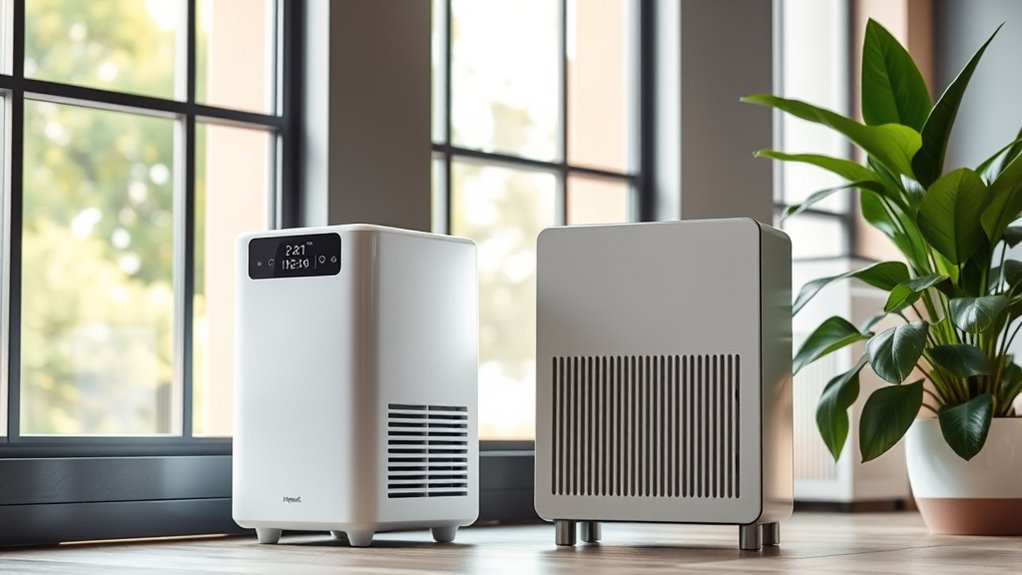 When choosing between air purifiers and ionizers for your home, I consider how much filtration I need. Air purifiers with HEPA and activated carbon filters effectively remove airborne particles, odors, and chemicals, making them safer and more extensive. Ionizers help reduce allergens and odors but may produce low ozone levels, which isn’t ideal for sensitive people. Keep exploring to find out which option fits your space and safety concerns perfectly.