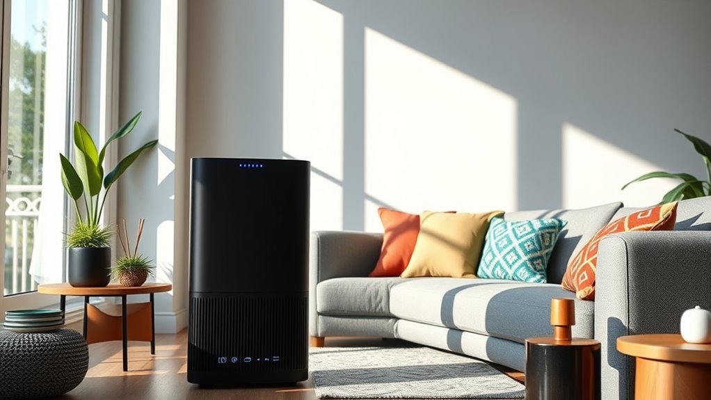 When selecting an air purifier for odor removal, paying attention to noise levels is vital for ensuring it doesn’t disrupt your sleep. Many models operate quietly, with sleep-friendly options running at 20-30dB, which is barely noticeable. Ultra-quiet or Sleep Modes can reduce noise to below 24dB, creating a nearly silent environment perfect for restful nights. Placement also matters; positioning the purifier away from your bed or in a corner can help minimize perceived noise. Some models incorporate noise-reduction features like sound insulation or vibration dampening, enhancing sleep comfort. Maintaining a consistent, low noise level is essential, especially if you’re sensitive to sound or a light sleeper. Prioritizing noise levels ensures your odor-neutralizing efforts don’t come at the expense of a good night’s sleep.