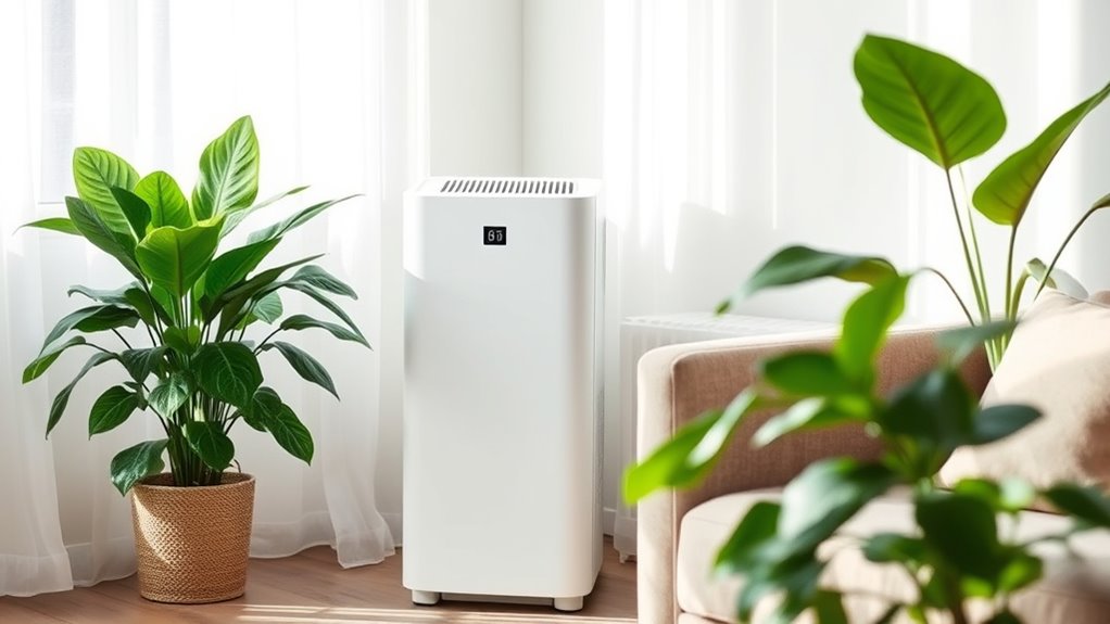 Choosing an air purifier that matches your room size is essential for effective air cleaning. You want to guarantee the device’s maximum coverage area meets or exceeds your space, so it can work efficiently. Check the CADR (Clean Air Delivery Rate) ratings to see how quickly it can clean the air in your room. Larger rooms need models with higher airflow capacity, usually measured in CFM (cubic feet per minute). It’s important to verify that the recommended room size aligns with your space to avoid underperformance. Additionally, opt for models with adjustable fan speeds, so you can tailor the airflow based on your needs. Proper room size compatibility ensures you get the best results without wasting energy or money.