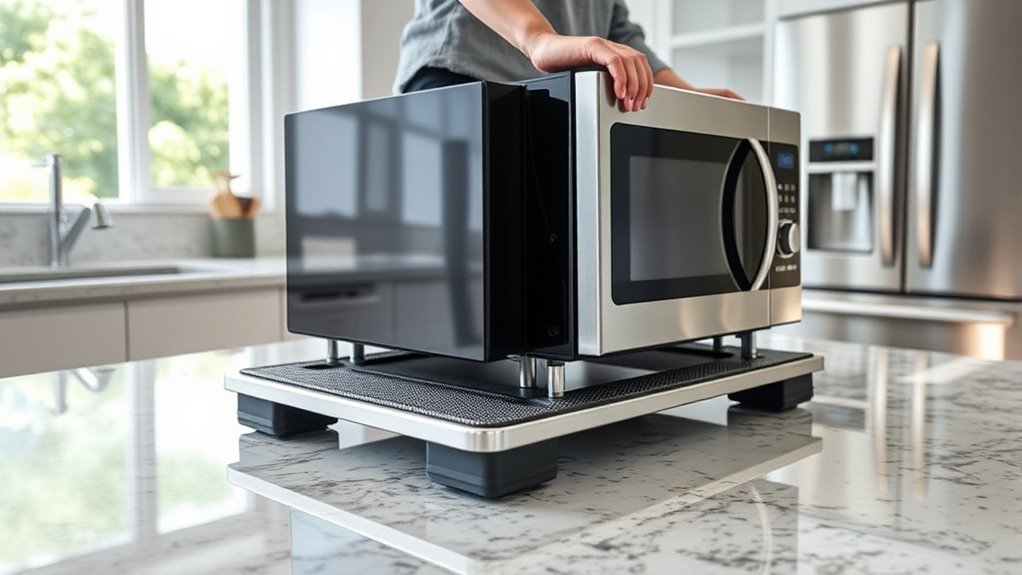 When using appliance sliders, I always make sure to wear sturdy gloves to protect my hands. I clear the area of obstacles and guarantee the floor is dry and clean to prevent slipping. I also lift the appliance slightly before placing sliders underneath to avoid sudden shifts. Taking these precautions helps me move heavy devices safely without risking injury or damage. Safety first always, especially with heavy appliances!