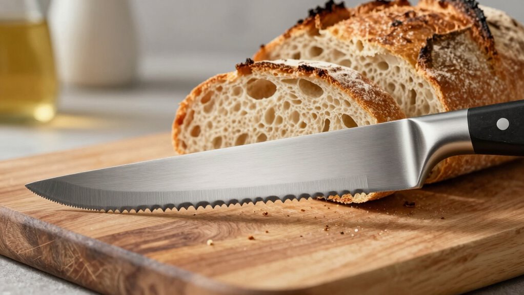 The type of serration on a bread knife considerably influences its cutting performance, especially when dealing with different bread textures. Scalloped serrations have rounded teeth that gently grip crusts, enabling smooth, tear-free slices of soft bread. Pointed serrations feature sharp, triangular teeth that easily pierce tough crusts, providing clean cuts on crusty loaves. Hybrid serrations combine both styles, offering a versatile option that handles soft and crusty bread effectively. Your choice depends on the bread you most often slice; scalloped blades excel with soft bread, while pointed serrations are better for crusty, dense loaves. Selecting the right serration type guarantees efficient, effortless slicing and helps maintain the bread’s appearance and texture.