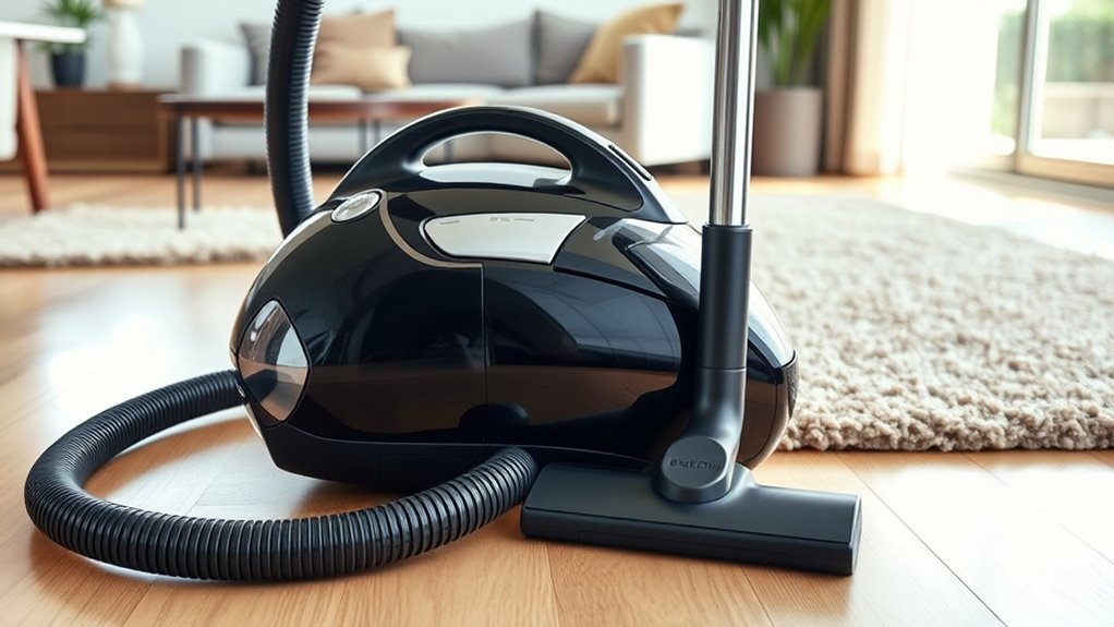 Ever notice how loud some vacuum cleaners can be and how it affects your overall cleaning experience? I’ve found that lower noise levels, around 60-70 decibels, make a huge difference—especially in homes with kids or pets. Vacuums with adjustable suction and sound controls let me pick quieter modes for delicate surfaces or noise-sensitive areas. Lightweight models reduce fatigue and make maneuvering easier, which is a real plus during long cleaning sessions. Noise insulation features, like soundproof casings or mufflers, help keep sound emissions down and are neighbor-friendly. Ergonomic designs with easy-to-reach controls and balanced weight distribution also boost comfort, reducing strain over time. When choosing a canister vacuum, these factors ensure a more pleasant, less stressful cleaning experience.