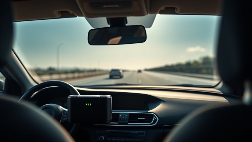 When considering how to power your car air purifier, it’s also important to think about noise levels during operation. Noise is measured in decibels (dB), with lower levels indicating quieter operation, which is key for comfort. Many models run at 15-30 dB in sleep or low mode, ensuring minimal disturbance during rest or work. However, higher fan speeds or stronger filtration systems can produce sounds exceeding 40 dB, potentially distracting you while driving or relaxing. Quiet operation is especially crucial if you plan to use the purifier during sleep or concentration. Some units come with noise reduction features, like silent fans or soundproofing, that let you enjoy effective filtration without sacrificing peace and quiet. Prioritizing low noise levels enhances your overall experience.