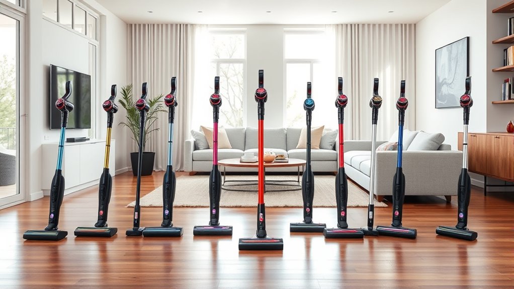 Many cordless vacuum stands come equipped with safety features that guarantee stability and security. I’ve found that some models have anti-tip designs, which keep the vacuum upright even on uneven surfaces. Additionally, they often include locking mechanisms to prevent accidental release. I appreciate these thoughtful touches because they not only enhance safety but also make using my vacuum hassle-free. So, you can clean confidently without worrying about potential mishaps!