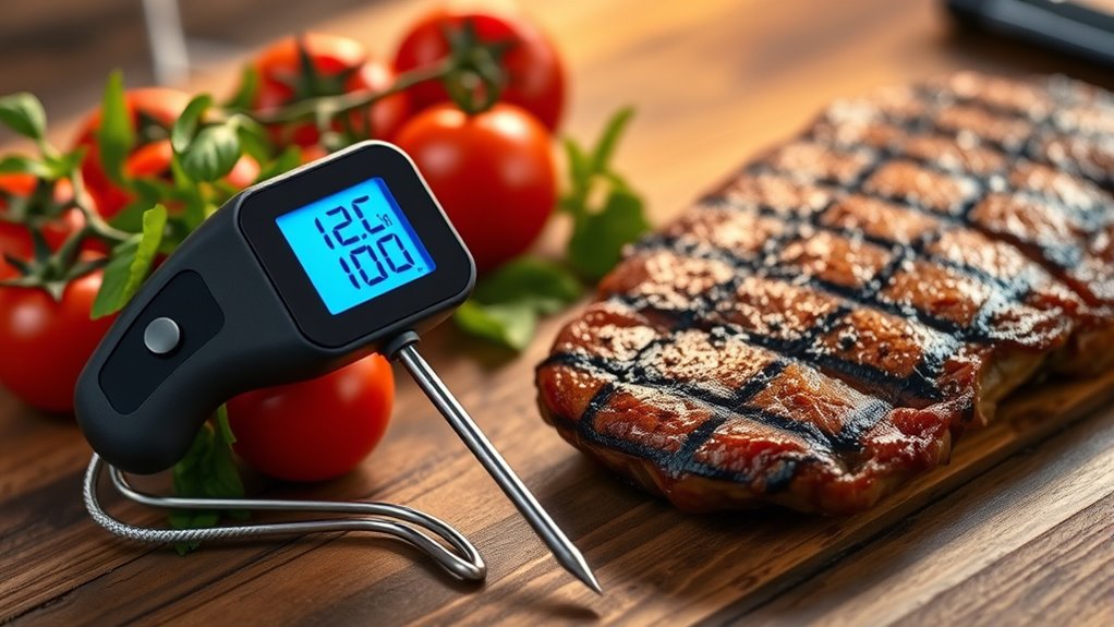 If you want perfectly cooked meals, I recommend checking out the 13 best digital meat thermometers, which offer quick, accurate readings and user-friendly features. From instant read models with ±0.5°F precision to smart wireless options with dual probes, these tools meet every cooking need. Waterproof, fast, and often Bluetooth-enabled, they help you hit the perfect temperature every time. Keep exploring to discover which thermometer best fits your kitchen style and culinary goals.