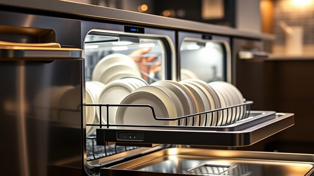 The latest dishwasher models in 2025 are incredibly energy-efficient, often surpassing previous standards. I’ve noticed they use less water and electricity, thanks to smart sensors and improved technology. These models help me save on utility bills while still cleaning thoroughly. If you’re looking to be eco-friendly and cut costs, I highly recommend checking out the newest innovations—they’re designed to make your life easier and greener.