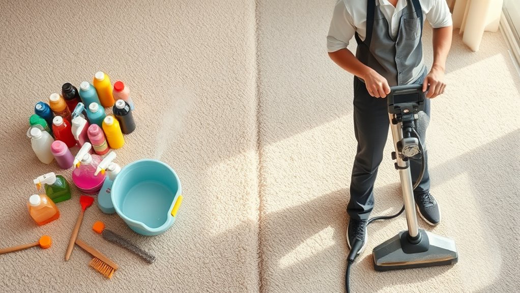 When comparing DIY carpet cleaning tips and professional services, I find that DIY methods are more budget-friendly and suitable for light stains and regular maintenance, but they can be time-consuming and less effective on deep stains. Professional cleaning offers deeper, faster results for heavily soiled carpets or delicate fabrics, though it costs more. If you want to weigh the pros and cons thoroughly, there’s more valuable information to help you decide what’s best for your carpets.