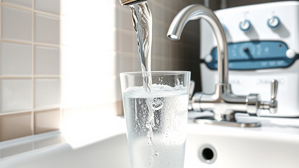 Mineral buildup from hard water can considerably shorten the lifespan of household appliances like dishwashers, water heaters, and washing machines. Over time, calcium and magnesium deposits form scale that damages internal components and reduces efficiency. This buildup forces appliances to work harder, increasing energy consumption and accelerating wear and tear. Using a water softener prevents these deposits, helping appliances operate smoothly and last longer. Regularly softened water minimizes mineral-induced corrosion, protecting essential parts and reducing the risk of breakdowns. Monitoring your appliances for early signs of scale—such as decreased efficiency or unusual noises—can alert you to the need for a water softener. Investing in one can save you money on repairs and replacements, ensuring your appliances stay functional and efficient for years to come.