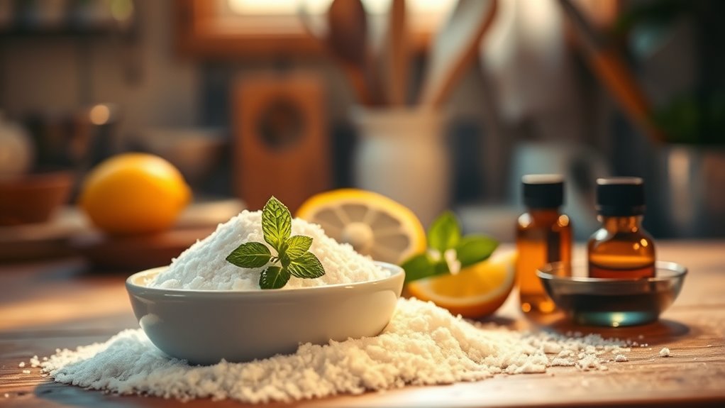 When choosing odor control options, it’s important to contemplate the benefits of chemical-free solutions like baking soda. These options rely on natural absorption and neutralization, making them a healthier choice for your home. Baking soda’s effectiveness comes from its ability to react with both acidic and basic odor molecules, transforming them into less offensive compounds. Unlike scented deodorizers that merely mask odors, baking soda actively neutralizes them, providing true odor elimination. It’s non-toxic and safe around food, children, and pets, which adds to its appeal as a chemical-free method. Additionally, its porous structure traps odor molecules at a molecular level, offering long-lasting freshness without the need for chemical additives. This makes baking soda a simple, effective, and safe odor control solution.