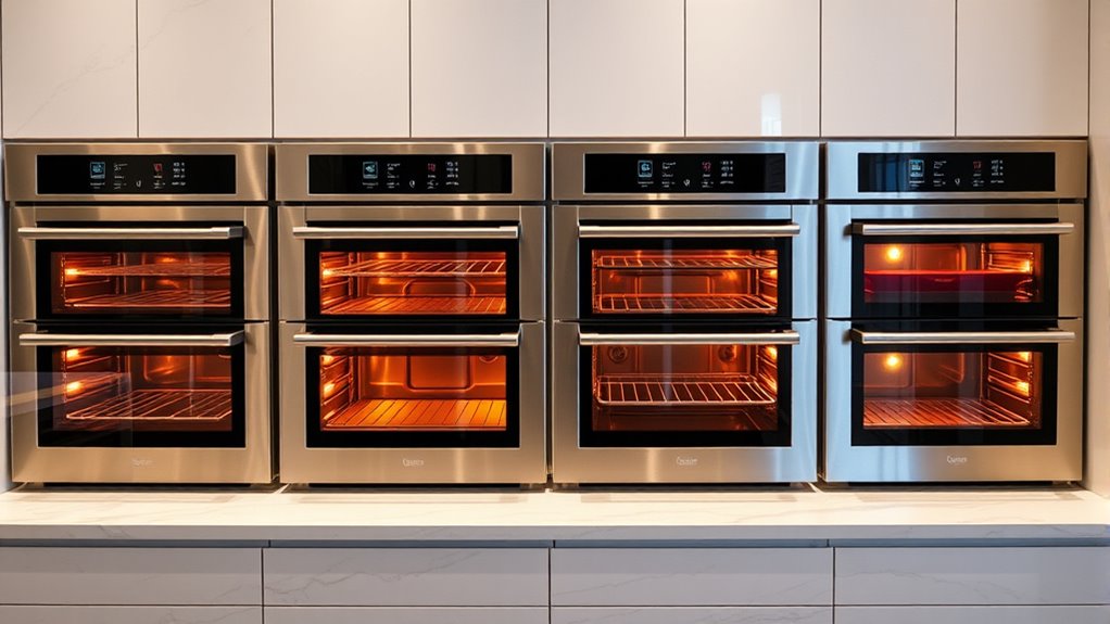 Choosing a space-saving double oven means looking for models that maximize kitchen efficiency without compromising on capacity. Many compact designs feature dual compartments, allowing you to cook multiple dishes simultaneously without taking up extra space. Flat or sliding doors make access easier in tight kitchens, preventing door swing issues. Some models use nesting or stacking configurations, which optimize vertical space and free up countertop or cabinet area. Multi-functional appliances also combine oven functions with other features, helping you conserve space while expanding functionality. These innovative designs ensure you get the performance of a double oven without cluttering your kitchen. When selecting a space-efficient model, prioritize those that balance capacity with a thoughtful layout to suit your cooking needs and available space.
