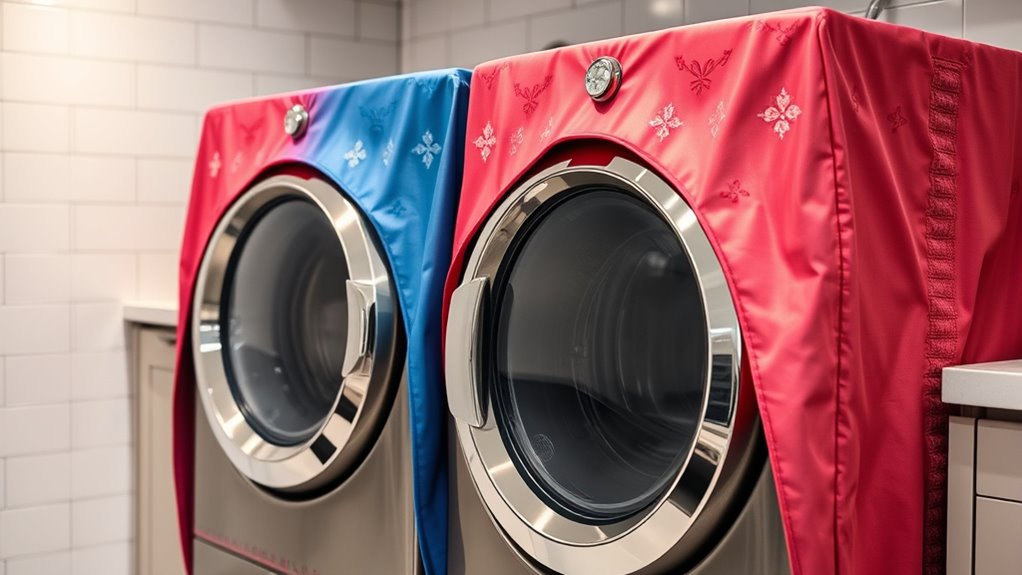 Looking for the best dryer covers to protect and prolong your appliance? I’ve found options made from durable, waterproof materials like Oxford fabric and silicone rubber that shield against dust, water, and outdoor elements. Many feature adjustable straps, zippers, and breathability to guarantee a snug, secure fit. Whether you want a simple, affordable cover or a high-end weatherproof one, there’s something for every need. Keep going to discover popular choices and tips to choose the perfect cover.