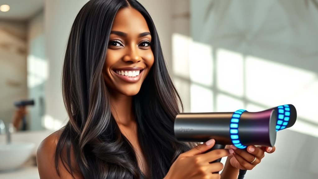 When evaluating Dyson hair styling tools, their ease of use is often a key factor that sets them apart. I appreciate their ergonomic, lightweight design, which reduces fatigue during long styling sessions. Magnetic attachments and intuitive controls make switching functions quick and effortless, saving time and frustration. Many models feature intelligent heat regulation, maintaining consistent temperatures that simplify styling and prevent damage. Clear LCD screens and user-friendly interfaces allow me to easily adjust settings and monitor performance without confusion. The streamlined design minimizes clutter, making the tools easier to handle and maneuver. Overall, Dyson’s focus on usability ensures that both beginners and pros can achieve professional results with less effort, making these tools a smart choice for anyone seeking hassle-free styling.