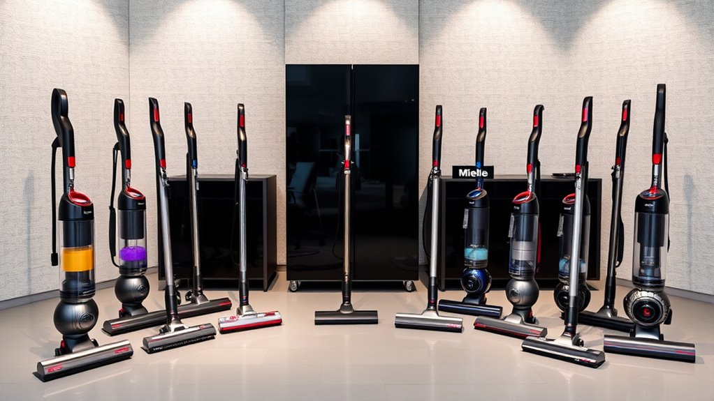 In 2025, both Dyson and Miele offer exceptional vacuum options, each excelling in different areas. Dyson’s cordless models shine with lightweight design, powerful suction, and quick maneuverability, perfect for fast clean-ups. Miele’s traditional and cordless vacuums emphasize superior filtration, versatile tools, and deep cleaning, ideal for allergy sufferers and thorough home care. Ultimately, your choice depends on your cleaning style—stick around to discover which brand might suit your needs best.